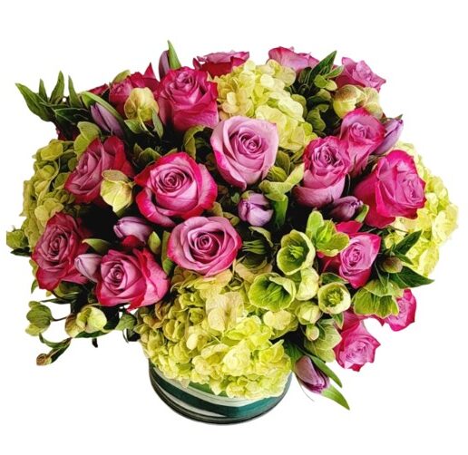 Send your loved one a vacation in a vase with the Blossom Garden Bouquet. This radiant arrangement feels like a personal oasis with eighteen lavender roses, green hydrangea and hypericum. Beautifully arranged pave style in a glass vase with an all-sided orientation.