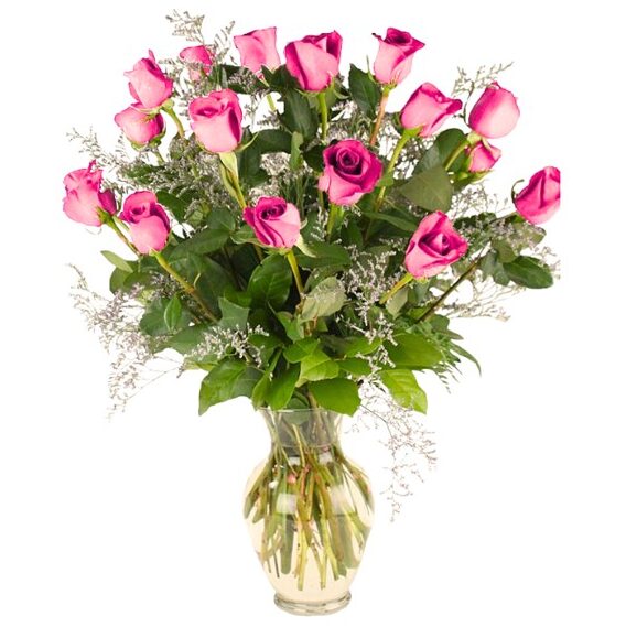 This bouquet includes a fresh mix of 18 pink long-stemmed roses, misty and assorted greenery. Beautifully arranged in a glass vase with an all-sided orientation.