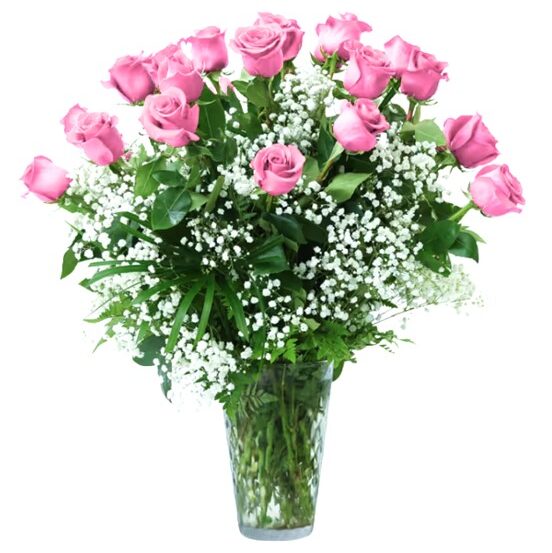 This bouquet includes a fresh mix of 24 pink long-stemmed roses, baby’s breath and assorted greenery. Beautifully arranged in a glass vase with an all-sided orientation.