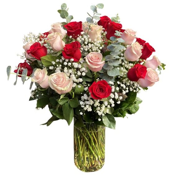 This bouquet includes a fresh mix of 12 red long-stemmed roses, 12 pink long-stemmed roses, baby’s breath and assorted greenery. Beautifully arranged in a glass vase with an all-sided orientation.