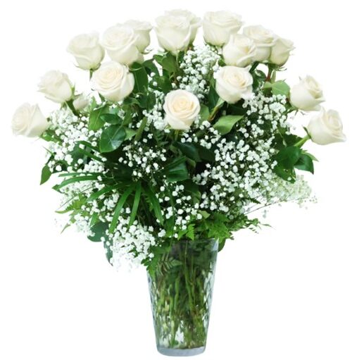 This bouquet includes a fresh mix of 24 white long-stemmed roses, baby’s breath and assorted greenery. Beautifully arranged in a glass vase with an all-sided orientation.