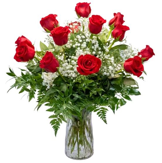 This bouquet includes a fresh mix of 12 red long-stemmed roses, baby’s breath and assorted greenery. Beautifully arranged in a glass vase with an all-sided orientation.