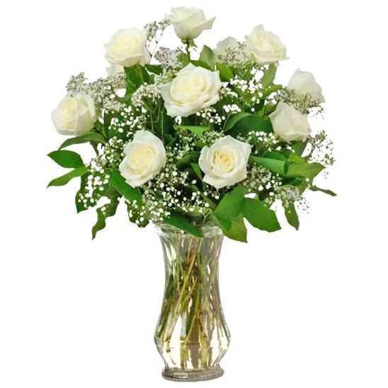 This bouquet includes a fresh mix of 12 white long-stemmed roses, baby’s breath and assorted greenery. Beautifully arranged in a glass vase with an all-sided orientation.