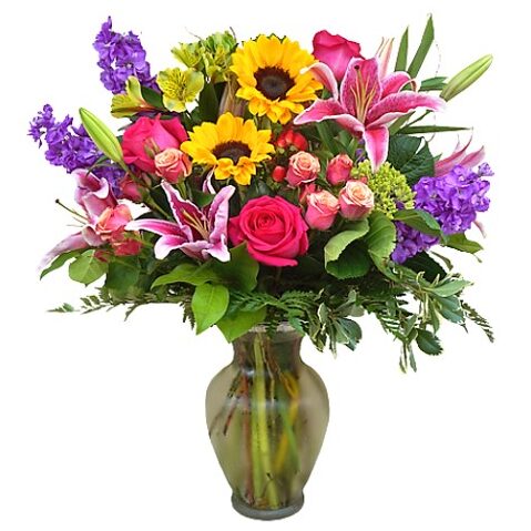 Let the celebration begin with the Floral Fiesta Bouquet. This vibrant combination of hot pink roses, lavender stock, sunflowers, stargazer lilies and assorted greenery will keep the birthday cheer going long after the party ends. Beautifully arranged in a glass vase with a one-sided orientation.