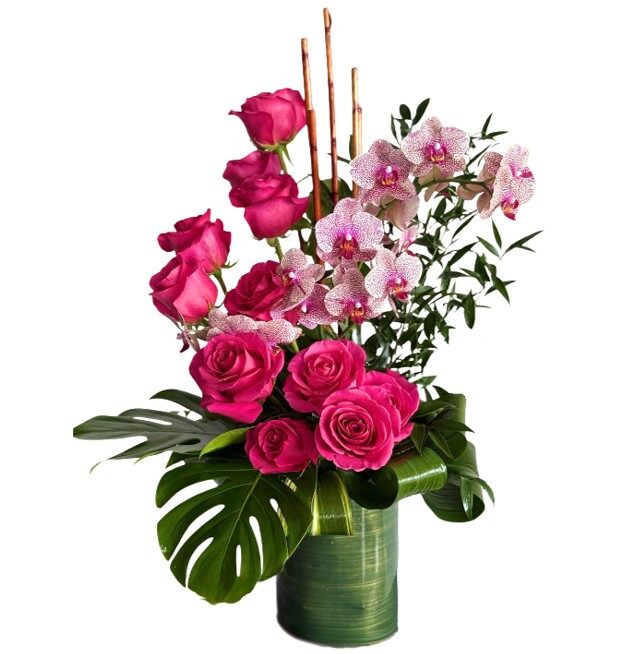 When you need a gift as divine as the person, send the Isn’t She Lovely Bouquet. This delicate arrangement elegantly showcases one dozen hot pink roses with a phalaenopsis orchid stem and tropical greenery for a simply stunning presentation. Beautifully arranged in a glass vase with a one-sided orientation.