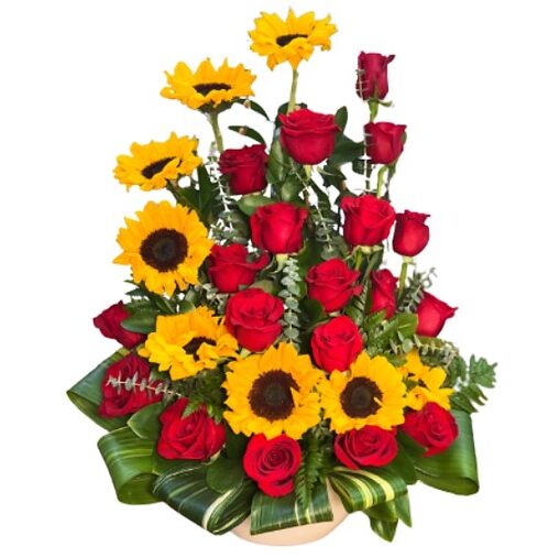 When you need to express how much you love and admire someone, send the Love You to the Moon Bouquet. This unique arrangement features sunflowers displayed in the shape of a crescent moon surrounded by eighteen red roses and assorted greenery. Beautifully arranged in a ceramic vase with a one-sided orientation.