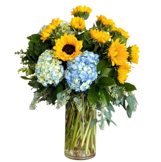 When you want someone to have the best start to their morning, send them the Morning Sky Bouquet. Resembling a warm sunny day, this arrangement features ten sunflowers, three blue hydrangea and assorted greenery to create the perfect pick-me-up. Beautifully arranged in a glass vase with an all-sided orientation.