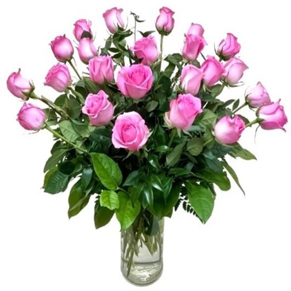 This bouquet includes a fresh mix of 24 pink long-stemmed roses and assorted greenery. Beautifully arranged in a glass vase with an all-sided orientation.