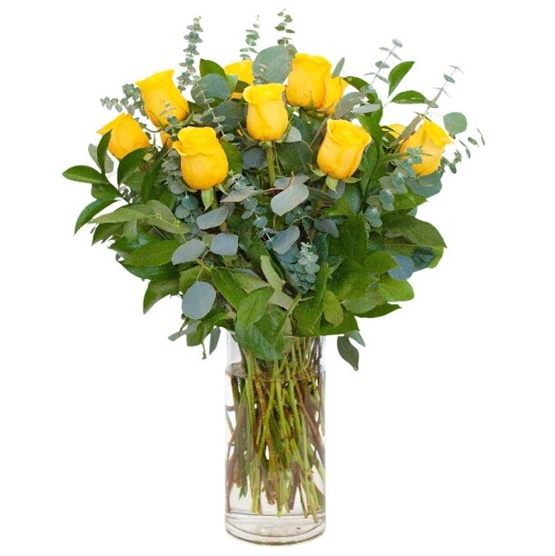 This bouquet includes a fresh mix of 12 yellow long-stemmed roses and assorted greenery. Beautifully arranged in a glass vase with an all-sided orientation.
